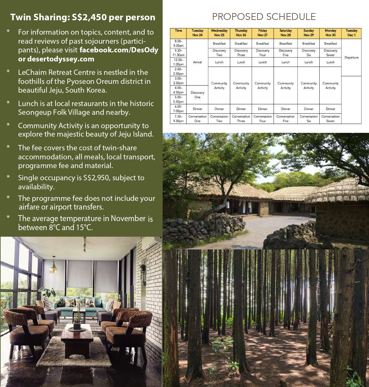 LeChaim Retreat Centre in Jeju, Korea, is nestled in the hills of the Pyoseon Oreum district, amidst bucolic surroundings of horse ranches, rolling hills, and healing forests. Desert Odyssey at LeChaim is structured to take in the natural beauty of Jeju. Comprising three UNESCO Heritage sites, Jeju offers the ideal location toexperience beauty, explore wonder, and examine possibilities.